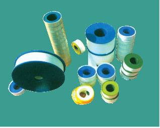 密封用聚四氟乙烯生料带、膨化带。采用膨体聚四氟乙烯树脂,它具有微细长纤维和节组成的网状膨体结构,并具韧性好、纵向强度高、横向易于变形的特点。它是盘根及螺纹上密封的理想材料。