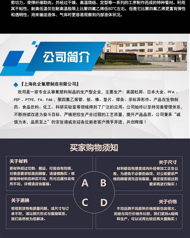 聚四氟乙烯管的成型工艺有模压法、推压法、挤压法、液压法、焊接法、缠绕法等,其中以模压和推压、挤压较为常见,应用范围较广。 聚四氟乙烯毛细管是由分散树脂和助推剂混合后,在有锥角的口模中受到剪切力,使纤维取向,并经干燥、高温烧结、定型等工序而制成的特种管材。其管子极期细微,根据其用途形成了一套独立的通用规格体系。